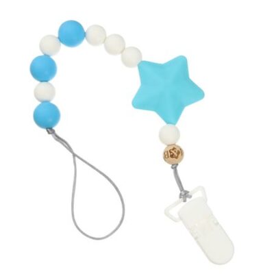 Держатель для соски — пустышки M&B «Звездочка», силиконовый, с прорезывателем. Прищепка для пустышки предотвратит потерю маленького предмета. Используйте специальный держатель, и соска всегда будет под рукой! Изделие фиксируется на одежде ребенка. На конце цепочки есть карабин, который зацепляется за кольцо пустышки. Надежное крепление убережет вещь от падения на пол, если малютка случайно выронит ее изо рта. С держателем можно играть, притягательный дизайн точно понравится малышу. Товар изготовлен из качественного нетоксичного материала. Подходит для деток с рождения.