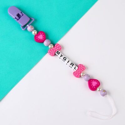 Держатель для соски — пустышки M&B «My girl». Прищепка для пустышки предотвратит потерю маленького предмета. Используйте специальный держатель, и соска всегда будет под рукой! Изделие фиксируется на одежде ребенка. На конце цепочки есть карабин, который зацепляется за кольцо пустышки. Надежное крепление убережет вещь от падения на пол, если малютка случайно выронит ее изо рта. С держателем можно играть, притягательный дизайн точно понравится малышу. Товар изготовлен из качественного нетоксичного материала. Подходит для деток с рождения.