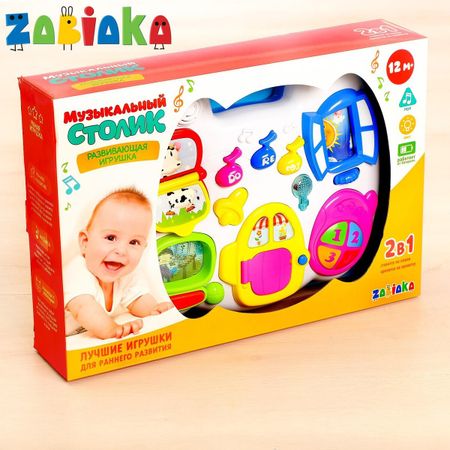 Детский столик-подвеска «Домик», световые и звуковые эффекты, работает от батареек. Развивающий столик-подвеска «Домик» разработан для малышей от 1 года. С ним кроха разовьет мелкую моторику рук, логику, воображение, внимание и усидчивость. Игрушка безопасна для малышей, не содержит мелких деталей. Столик можно крепить на кроватку в качестве подвески. <b> Как играть?</b> <ul> <li> Пусть ребенок покрутит колесико, и ночь в окошке сменит утро.</li> <li> Листайте книжку вместе с малышом и изучайте животных.</li> <li> Как только ребенок откроет дверцу домика, его поприветствует собачка.</li> <li> Предложите крохе нажимать на нотки, так он будет развивать музыкальный слух.</li> </ul>