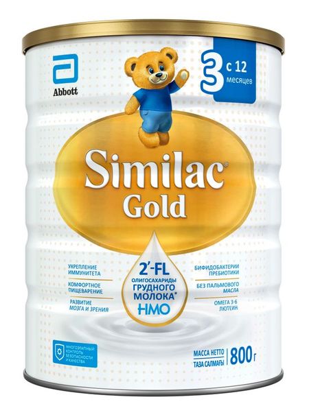 Детское молочко Similac Gold 3 смесь с 2′-FL олигосахаридами грудного молока, которые способствуют укреплению иммунитета и защите от инфекций. В составе пре- и пробиотики для здоровья микрофлоры, Омега-3 и Омега-6 для развития мозга и лютеин для здоровья глаз, а содержание белка и железа соответствует потребностям детского организма. От компании Abbott одной из ведущих международных компаний в сфере здравоохранения. Производится в Европе на основе последних научных данных и в соответствии с высокими стандартами качества. Содержит 2-FL олигосахариды грудного молока для укрепления иммунитета*. В 2 раза меньше инфекций* Не содержит пальмовое масло, ГМО, красители, консерванты и глютен. Сбалансированный состав Similac Gold для полноценного роста и развития: Олигосахариды грудного молока 2′-FL укрепляют иммунную систему малыша и защищают от инфекций, а также действуют как пребиотики, способствуя росту нормальной микрофлоры кишечника и комфортному пищеварению. Бифидобактерии B.lactis эффективный и хорошо изученный пробиотик, помогает развитию здоровой микрофлоры кишечника и поддержанию здоровья пищеварительной системы. Лютеин входит в состав грудного молока и важен для здоровья глаз, не вырабатывается в организме, поэтому малыш может получить его только с питанием. Пребиотики FOS являются пищей для полезной микрофлоры кишечника, способствуют мягкому стулу. Нуклеотиды строительный материал для ДНК всех клеток организма, способствуют развитию иммунной системы малыша. Омега-3 и Омега-6, включая DHA и ARA незаменимые жирные кислоты для развития мозга и зрения. Витамины и минералы (С, D, E, Ca, Mg, P и др.) необходимы для здорового роста и полноценного развития ребенка. Без пальмового масла отсутствие пальмового масла способствует уменьшению запоров и более высокому усвоению кальция** Важное примечание: Грудное молоко лучшее питание для ребёнка, его необходимо сохранять как можно дольше. Перед применением необходима консультация специалиста. Возраст применения смеси указан на упаковке.