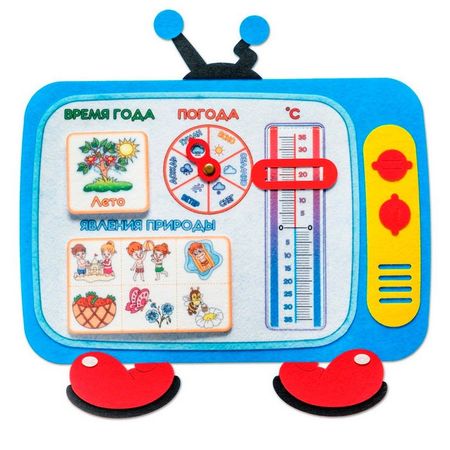 Дидактический коврик «Телевизор» — игра для формирования представлений о природных и погодных явлениях, развития памяти, логического мышления, речи.Как играть?Игра «Телевизор». Рассмотрите телевизор вместе с ребёнком. Обратите внимание на круг с символами погоды, расскажите, что они обозначают. Объясните, что такое термометр, для чего он нужен. Обсудите назначение телевизора и правила его использования. Спросите ребёнка, какую телепрограмму показывают по телевизору? Уточните, для чего нужен прогноз погоды.Игра «Времена года». Выберите любую большую карточку «Явления природы» и попросите ребёнка рассказать, что на ней изображено. Спросите, когда это бывает? Предложите ребёнку подобрать к большой карточке соответствующую маленькую карточку «Время года». Подобным образом рассмотрите остальные карточки.Игра «Круглый год». Выложите 4 большие карточки «Явления природы» в ряд перед ребенком. Объясните, что времена года повторяются, поэтому говорят «круглый год». Попросите разложить большие карточки по кругу по порядку смены времен года, начиная с весны. Каждый раз спрашивайте, какое время года наступит потом.Игра «Какая сейчас погода?». Расскажите ребёнку, кто такой метеоролог (человек, который изучает погоду и умеет её определять). Попросите малыша посмотреть в окошко, чтобы определить, какая сейчас погода на улице. Предложите «зафиксировать» все наблюдения ребёнка на телевизоре: установить температуру воздуха, с помощью красной стрелки указать сектор с соответствующей погодой, выбрать подходящие карточки «Явления природы» и «Время года» и прикрепить их к телевизору.Игра «Прогноз погоды». Предложите ребёнку представить себя в роли ведущего телепрограммы «Прогноз погоды». Попросите составить прогноз погодных явлений, рассказать об изменениях природы предстоящей поры года, прикрепив соответствующие картинки на телевизор.ОсобенностиМатериал: фанера.Размер: 31 × 31 см.