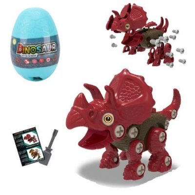 Этот необычный пластиковый динозаврик-конструктор спрятан внутри большого яйца. Внутри яйца спрятаны динозаврика 3-х видов: тираннозавр, трицератопс, птеродактиль.