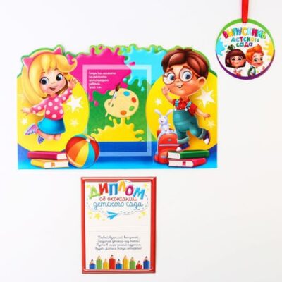 Диплом-фоторамка на выпускной «Об окончании детского сада», 350 г/м². <b> Диплом-фоторамка на выпускной «Об окончании детского сада», 350 г/м²</b> Такой диплом-фоторамка в комплекте с медалью не оставит ни одного ребенка равнодушным, поможет сделать выпускной особенно торжественным и останется на долгую память! размер рамки — 24 x 15 см.; размер диплома — 12 х 9 см.; плотность картона — 350 гр/кв.м.; размер места под фото — 9 x 12 см.; диаметр медали — 7,5 см.