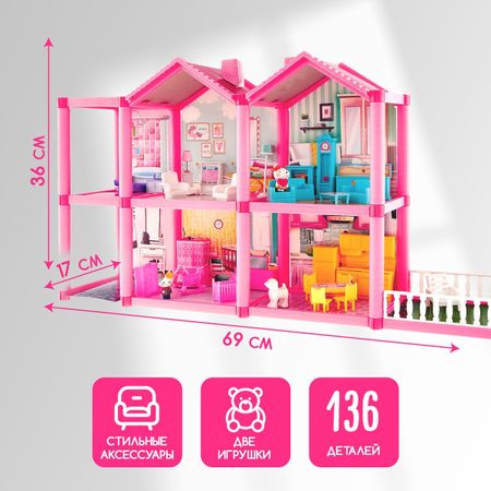 Дом для кукол «Кукольный дом» с мебелью и аксессуарами. Малышка придет в восторг от яркого домика. Стильная мебель, модный интерьер — красочные разнообразные предметы с первых секунд завладеют вниманием девочки. Малышка создаст настоящий райский уголок для всей кукольной семьи и обустроит для них каждую комнату дома. А еще придумает множество увлекательных сюжетно-ролевых игр. В наборе есть все необходимое: комод и кровать, кухонный гарнитур и холодильник, пианино в гостиной. Вся комплектация представлена на фото и в описании. Размер дома: 60 × 17 × 36 см. Игры с набором способствуют развитию воображения, мышления, цветового и эмоционального восприятия ребенка. Девочка осваивает социальные роли, проецирует на сюжеты модели поведения взрослых, учится заботе и ответственности.