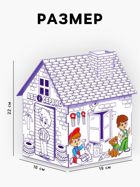 Домик-раскраска «Мой гараж», 3 в 1. Домик-раскраска «Автосервис» способствует формированию творческих способностей, мелкой моторики, усидчивости и внимательности. Можно раскрашивать рисунки на стенах и играть с домиком. Окна и двери открываются. Домик сделан из плотного картона и легко собирается. Не надо вырезать и склеивать детали.