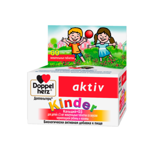 ДОППЕЛЬГЕРЦ® KINDER КАЛЬЦИЙ+D3 ДЛЯ ДЕТЕЙ С 3 ЛЕТЖЕВАТЕЛЬНЫЕ ТАБЛЕТКИ СО ВКУСОМ ЧЕРНОПЛОДНОЙ РЯБИНЫ И МАЛИНЫ Компоненты способствуют росту и развитию костной системы, своевременному и правильному формированию зубов Дополнительный источник кальция и витамина D3 Не содержит искусственных красителей и консервантов Для детей с 3 летВитамин D3 – Витамин D3 увеличивает всасывание кальция в тонком кишечнике, а точнее, эту функцию выполняют его производные, образующиеся в организме. Поскольку витамин D3 регулирует процесс усвоения кальция и фосфора, он играет ключевую роль в нормальном формировании костей и зубов. Правильное формирование костной ткани и зубов — очень важный процесс для детей, закладывающий фундамент здоровья. Витамин D3 предотвращает развитие рахита у детей, применяется для профилактики остеопороза.Кальций — является основным компонентом костей и зубов. Кроме этого, кальций регулирует работу нервной системы, участвует в механизме свертывания крови, способствует правильному формированию мышечной системы. При недостатке кальция в рационе наблюдаются частые “спонтанные” переломы костей (остеопороз), истирание и разрушение зубов, возникает кариес.
