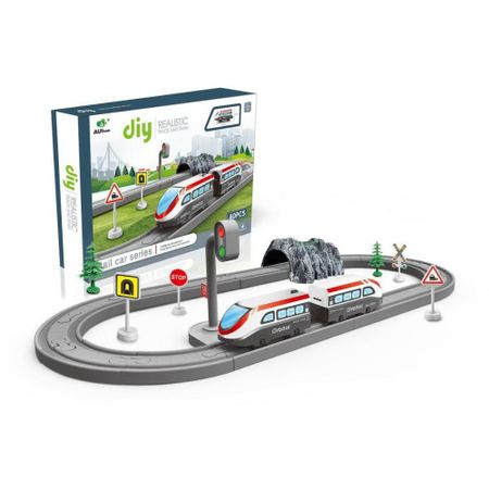 Игровой набор с железной дорогой — это веселые приключения и радостные эмоции, которые ребенок получит вместе с таким замечательным подарком.Поезд, входящий в состав этого набора, выполнен в современном дизайне. Он состоит из двух вагонов с магнитной сцепкой, каждый из которых может стать головным. Направление его движения можно выбрать при помощи переключателя на крыше одного из локомотивов. В полотно железной дороги встроен блок с семафором. Его сигнал можно переключать с зеленого света на красный, разрешая или запрещая движения поезду. Дополняет набор элемент ландшафтного дизайна — туннель, который нужно разместить между рельсами. Все вагоны, рельсы и дополнительные аксессуары изготовлены из пластика.Играя, ребенок сможет придумать множество различных игр и получить от этого море удовольствия.В состав набора входят: 2 вагона-локомотива, 13 рельс разной формы, семафор – 2 детали, соединительные детали — 14 шт., дорожные знаки – 6шт., туннель, 2 дерева, лист с наклейками.Размер вагона-локомотива 11х5см. Размер трека в собранном виде 60х24х14смТребуемый элемент питания: 1 батарейки АА (не в комплекте).