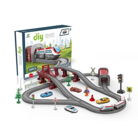 Игровой набор с железной дорогой — это веселые приключения и радостные эмоции, которые ребенок получит вместе с таким замечательным подарком.Поезд, входящий в состав этого набора, выполнен в современном дизайне. Он состоит из двух вагонов-локомотивов и одного обычного вагона с магнитной сцепкой между ними. Каждый из вагонов-локомотивов может стать головным. Направление его движения можно выбрать при помощи переключателя на крыше одного из локомотивов. Дополняют набор элементы ландшафтного дизайна – здание железнодорожной станции, которое нужно разместить между рельсами, мостовая конструкция, дорожные знаки, деревья, машинки, фигурка человека.Все вагоны, рельсы и дополнительные аксессуары изготовлены из пластика.Играя, ребенок сможет придумать множество различных игр и получить от этого море удовольствия.В состав набора входят: 2 вагона-локомотива, 1 вагон, рельсы разной формы, соединительные детали, дорожные знаки, здание железнодорожной станции, сборный мост, 4 машинки, фигурка человека — 1шт., 2 дерева, дорожный конус — 1шт, лист с наклейками.Размер вагона-локомотива 11х5см. Размер трека в собранном виде 77х66х15см.Требуемый элемент питания: 1 батарейки АА (не в комплекте).