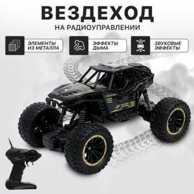 Джип «Вездеход», работает от аккумулятора, радиоуправление, дым, элементы из металла, черный. Черный внедорожник на радиоуправлении – это идеальный выбор для тех, кто ценит динамичные игры и реалистичные эффекты. Машина готова к покорению любых трасс, создавая захватывающие дымовые следы. <strong> Особенности</strong> <ul> <li> Движение во всех направлениях без ограничений.</li> <li> Реалистичные дымовые эффекты добавляют азарта в гонки.</li> <li> Масштаб 1:18 обеспечивает компактность и детализацию.</li> <li> Металлические элементы делают конструкцию прочной.</li> <li> Максимальная скорость достигает 10 км/ч.</li> </ul> <strong> Удобство использования</strong> <ul> <li> Питание машины от аккумулятора 3,7В обеспечивает до 25 минут активной езды.</li> <li> Пульт управления работает на расстоянии до 25 метров.</li> <li> Требуется 2 батарейки типа AA для пульта (не входят в комплект).</li> <li> Подходит для детей старше 6 лет.</li> </ul> <strong> Играем с пользой</strong> Управление машиной развивает пространственное мышление и координацию движений. Ребенок учится планировать траекторию и контролировать скорость. Наземный транспорт – отличный способ совместить развлечение с развитием полезных навыков. Черный цвет придает машине стильный внешний вид, а сочетание пластика и металла гарантирует долговечность даже при активной эксплуатации.