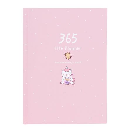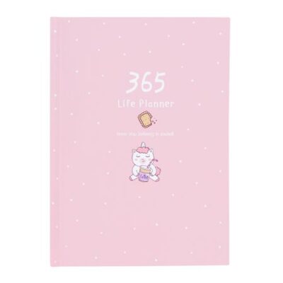 Ежедневник розового цвета с изображением единорога. Формат — А5. 104 листа с различной разлиновкой (в точку, в линейку, в клетку, с рисунками). Без привязки к году/месяцам. Твердый переплет. Ляссе.