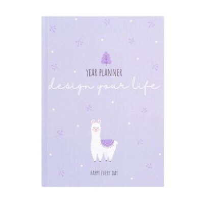 Ежедневник фиолетового цвета с изображением ламы и надписью. Формат — А5. 104 листа с различной разлиновкой (на месяц, неделю, каждый день). Без привязки к году/месяцам. Твердый переплет. Ляссе.