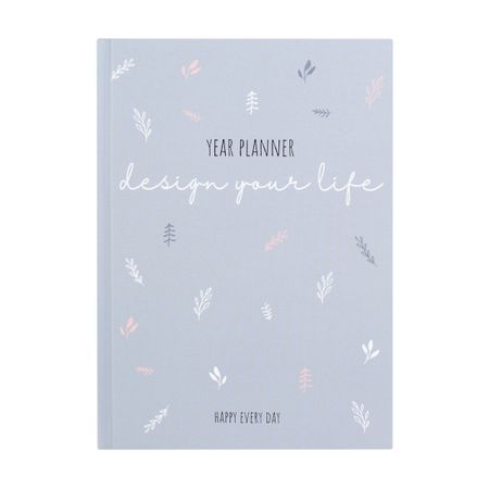 Ежедневник серого цвета с изображением листьев и веточек и надписью. Формат — А5. 104 листа с различной разлиновкой (на месяц, неделю, каждый день). Без привязки к году/месяцам. Твердый переплет. Ляссе.
