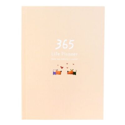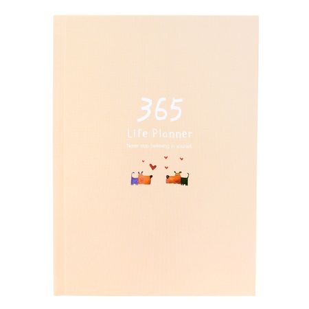 Ежедневник бежевого цвета с изображением собак. Формат — А5. 104 листа с различной разлиновкой (в точку, в линейку, в клетку, с рисунками). Без привязки к году/месяцам. Твердый переплет. Ляссе.