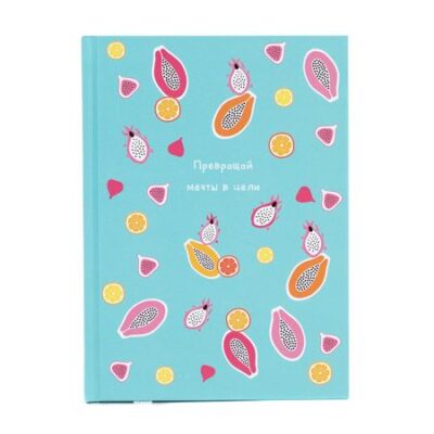 Ежедневник с изображением фруктов. Формат — B6. 104 листа с различной разлиновкой (на месяц, каждый день). Рассчитан на 13 месяцев по 31 дню. Без привязки к году/месяцам. К каждому месяцу есть: трекер привычек, лист с задачами. Твердый переплет. Ляссе.
