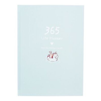 Ежедневник мятного цвета с изображением зайки и единорога. Формат — А5. 104 листа с различной разлиновкой (в точку, в линейку, в клетку, с рисунками). Без привязки к году/месяцам. Твердый переплет. Ляссе.
