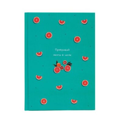 Ежедневник с изображением фруктов. Формат — B6. 104 листа с различной разлиновкой (на месяц, каждый день). Рассчитан на 13 месяцев по 31 дню. Без привязки к году/месяцам. К каждому месяцу есть: трекер привычек, лист с задачами. Твердый переплет. Ляссе.