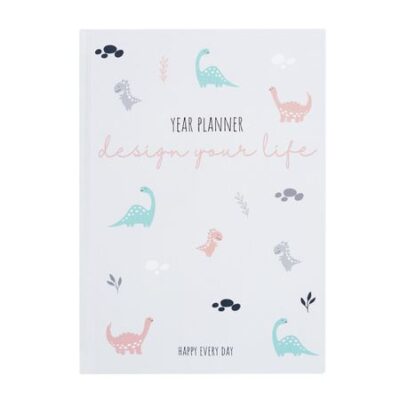Ежедневник серого цвета с изображением динозавриков и надписью. Формат — А5. 104 листа с различной разлиновкой (на месяц, неделю, каждый день). Без привязки к году/месяцам. Твердый переплет. Ляссе.