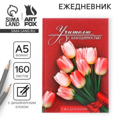 Ежедневник «Учителю с благодарностью», формат А5, твердая обложка картон 7БЦ, 160 листов. Ежедневник отлично подойдет в качестве подарка. Яркий дизайн несомненно привлечет внимание и будет выделяться , а удобный формат позволит использовать с комфортом. • Пиши • Планируй • Выполняй <ul> <li> Обложка : твердая;</li> <li> Количество листов: 160;</li> <li> Крепление : сшивной;</li> <li> Особенности : дизайнерский блок;</li> <li> Формат: А5;</li> <li> Упаковка: пленка.</li> </ul> Состав: -Бумага, картон.