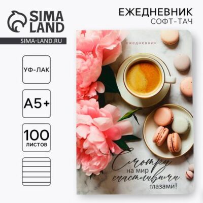 Ежедневник «Смотри на мир» А5+, 100 листов, мягкая обложка, софт-тач. Ежедневник станет прекрасным подарком на праздник. • Мечтай; • Записывай; • Выполняй. <ul> <li> Плотность, г/м²: 80;</li> <li> Вид обложки: мягкая;</li> <li> Формат: А5+;</li> <li> Форма: прямоугольник ;</li> <li> Количество листов: 100 ;</li> <li> Линовка блока: линейка ;</li> <li> Тип скрепления: на склейке .</li> </ul>