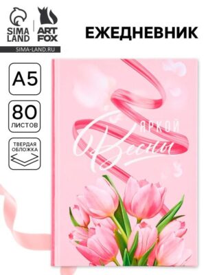 Ежедневник «Яркой весны» А5, 80 листов. Ежедневник станет прекрасным подарком на праздник. • Мечтай; • Записывай; • Выполняй. <ul> <li> Плотность, г/м²: 80;</li> <li> Вид обложки: твердая;</li> <li> Формат:А5;</li> <li> Форма: прямоугольник ;</li> <li> Количество листов: 80 ;</li> <li> Линовка блока: линейка ;</li> <li> Тип скрепления: сшивной .</li> </ul>