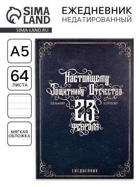 Ежедневник А5, 64 листа, недатированный, в точку «Настоящему защитнику. 23 февраля». Ежедневник станет прекрасным подарком на праздник. • Мечтай; • Записывай; • Выполняй. <ul> <li> Плотность, г/м²: 80;</li> <li> Вид обложки: мягкая;</li> <li> Формат: А5;</li> <li> Форма: прямоугольник ;</li> <li> Количество листов: 64 ;</li> <li> Линовка блока: в точку ;</li> <li> Тип скрепления: на склейке .</li> </ul>