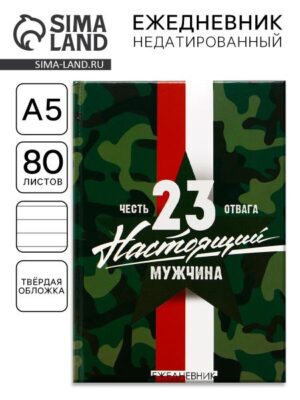Ежедневник А5, 80 листов, недатированный, в твердой обложке «Настоящий мужчина. 23 февраля». Ежедневник станет прекрасным подарком на праздник. • Мечтай; • Записывай; • Выполняй. <ul> <li> Плотность, г/м²: 80;</li> <li> Вид обложки: твердая;</li> <li> Формат:А5;</li> <li> Форма: прямоугольник ;</li> <li> Количество листов: 80 ;</li> <li> Линовка блока: линейка ;</li> <li> Тип скрепления: сшивной .</li> </ul>