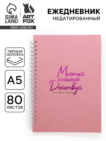 Ежедневник А5, 80 листов в твердой обложке на гребне «Мечтай». Ежедневник – лучший помощник делового человека. Он пригодится всегда и везде: планируйте, записывайте задачи, контакты, важную информацию, полезные расчеты и идеи — все, что понадобится для успешной работы. <b> Преимущества:</b> <ul> <li> твердая обложка;</li> <li> недатированные листы;</li> <li> индивидуальный дизайн.</li> </ul> Стройте планы, записывайте мудрые мысли, сохраняйте важную информацию. Хороший ежедневник — половина успеха!
