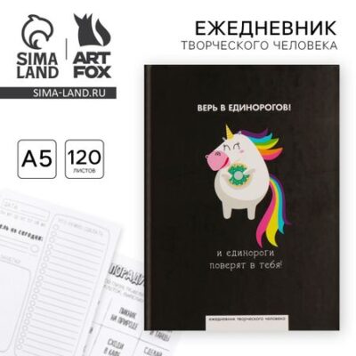 Ежедневник творческого человека с заданиями А5, 120 л. В твердой обложке «Верь в единорогов». Дневник поможет составить план на день и всегда иметь под рукой список самых-самых важных дел. А еще станет твоим незаменимым помощником, когда ты захочешь отвлечься, развлечься и немножко пошевелить мозгами. Внутри тебя ждет: <ul> <li> Творческие челленджи;</li> <li> Задачки на креативность;</li> <li> Трекеры полезных привычек;</li> <li> Чек-листы фильмов, книг, интересных мест.</li> </ul> Все и многое другое можно делать прямо на страницах дневника!
