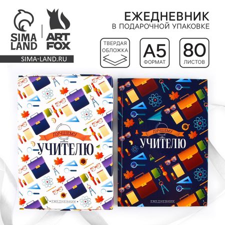 Ежедневник в подарочной коробке «Лучшему учителю», формат А5, 80 листов, твердая обложка. Ежедневник отлично подойдет в качестве подарка. Яркий дизайн несомненно привлечет внимание и будет выделяться , а удобный формат позволит использовать с комфортом. • Пиши • Планируй • Выполняй <ul> <li> Обложка : твердая;</li> <li> Количество листов: 80;</li> <li> Крепление : сшивной;</li> <li> Линовка : линейка;</li> <li> Формат: А5;</li> <li> Упаковка: пленка.</li> </ul> Состав: -Бумага, картон.