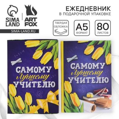 Ежедневник в подарочной коробке «Самому лучшему учителю», формат А5, 80 листов, твердая обложка. Ежедневник отлично подойдет в качестве подарка. Яркий дизайн несомненно привлечет внимание и будет выделяться , а удобный формат позволит использовать с комфортом. • Пиши • Планируй • Выполняй <ul> <li> Обложка : твердая;</li> <li> Количество листов: 80;</li> <li> Крепление : сшивной;</li> <li> Линовка : линейка;</li> <li> Формат: А5;</li> <li> Упаковка: пленка.</li> </ul> Состав: -Бумага, картон.