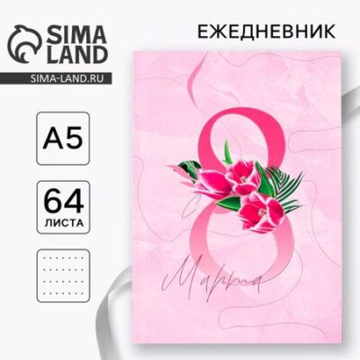 Ежедневник в точку А5, 64 листа «8 марта. Вдохновляй». Ежедневник станет прекрасным подарком на праздник. • Мечтай; • Записывай; • Выполняй. <ul> <li> Плотность, г/м²: 80;</li> <li> Вид обложки: мягкая;</li> <li> Формат: А5;</li> <li> Форма: прямоугольник ;</li> <li> Количество листов: 64 ;</li> <li> Линовка блока: в точку ;</li> <li> Тип скрепления: на склейке .</li> </ul>