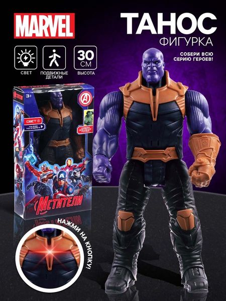 Встретьтесь лицом к лицу с Таносом — самым мощным и грозным злодеем во вселенной Marvel! Этот колосс в бронированном костюме и с пугающей силой способен сразить любого противника. Светящийся элемент на груди и подвижные руки делают Таноса ещё более реалистичным, превращая каждую игру в эпическое сражение за судьбу Вселенной. С этим величественным врагом можно разыгрывать самые грандиозные битвы добра и зла!Особенности игрушкиПодходит для детей от 3 лет.Размер: 17,6 х 6 х 30 см.Детализированный дизайн брони Таноса подчёркивает его силу и величие.Светящийся элемент на груди добавляет эффектности, особенно в игровых сюжетах о захвате силы.Подвижные руки позволяют придумывать динамичные позы для увлекательных сцен.Часть коллекции героев Marvel, вдохновляющей на сбор всей команды и противников.Изготовлена из безопасного и прочного пластика, что обеспечивает долговечность и безопасность для ребёнка.Польза от игрыРазвитие воображения: создавая сюжеты с участием Таноса, дети развивают фантазию и навыки стратегического мышления.Грандиозные битвы: возможность разыгрывать сцены из фильмов или придумывать собственные миссии делает игру яркой и увлекательной.Интерес к коллекционированию: фигурка станет частью уникальной коллекции героев и злодеев, вдохновляя на сбор полной серии.