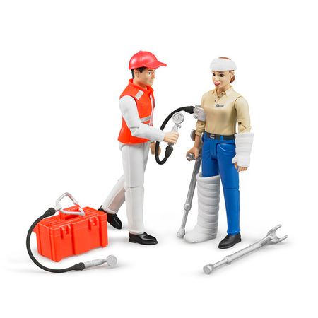 Содержание и характеристики набора: фигурка фельдшера в кепке и служебной форме; фигурка женщины в синих брюках и светлой рубашке; чемоданчик первой помощи; стетоскоп; прибор для измерения артериального давления; повязка на голову, гипс на руку и ногу; костыли для пациента; фигурки имеют подвижные конечности; высота фигурки – 10,7 мм; масштаб изделия 1:16; материал – высокопрочный пластик. Для развития сюжета можно дополнить артикулами: 02-528, 02-536, 02-596, 03-590. Набор из данных фигурок Брудер прекрасно подходит для игры с любой техникой службы спасения – скорой помощи, полиции, пожарных. С участием фельдшера, готового оказать первую помощь, и пациента, которому можно наложить гипс или повязку, можно разыграть реальную работу спасательных служб. Рекомендуется детям от 3-х лет. Безопасность Компания Bruder с особой тщательностью подходит к выбору материалов для своих игрушек. Все изделия выполнены из высококачественного пластика и металла, с использованием стойких и нетоксичных красок. Игрушки гипоаллергенны и абсолютно безопасны для здоровья детей.