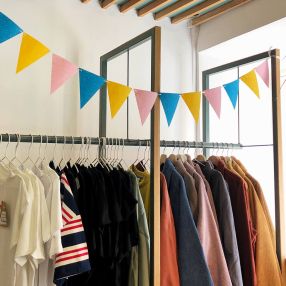 Синие, розовые и желтые флажки.