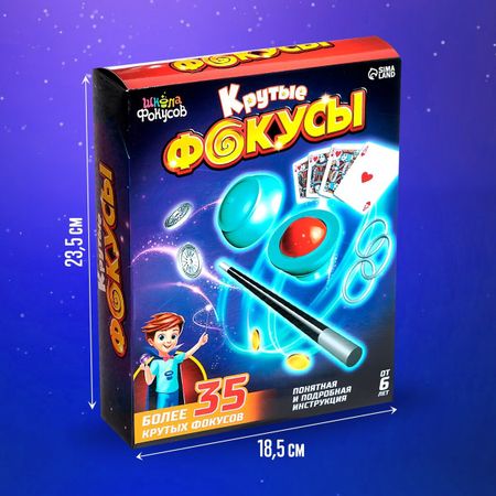 Фокусы «Крутые фокусы», набор 35 фокусов. Приветствуем юных фокусников! Этот набор перенесет вас в мир захватывающих шоу! С ним вы сможете разыграть своих близких. Создавайте уникальные образы, невероятные программы и поражайте публику. Повторяйте фокусы из инструкции, придумывайте свои и воплощайте их с помощью реквизитов из набора. <b> Список фокусов</b> <ol> <li> Появляющаяся волшебная палочка.</li> <li> Шаткая палочка.</li> <li> Палочка-прилипалочка.</li> <li> Профессиональная палочка-прилипалочка.</li> <li> Удивительная вращающаяся палочка.</li> <li> Подъем разума.</li> <li> Телепатическое кольцо.</li> <li> Пронумерованная палочка.</li> <li> Уклонение в сторону.</li> <li> Палочка, проходящая сквозь тело.</li> <li> Скользящее возникновение.</li> <li> Соединяющиеся кольца.</li> <li> Базовые трюки.</li> <li> Соедини два кольца трением.</li> <li> Соедини два кольца ударом.</li> <li> Разъединение двух колец.</li> <li> Перед твоими глазами.</li> <li> Кольцо и веревка.</li> <li> Прыгающие монеты — базовый трюк.</li> <li> Денежные путешествия.</li> <li> Монетка, проходящая сквозь стену.</li> <li> Привяжи это.</li> <li> Загадочный шар.</li> <li> Исчезающий шар.</li> <li> Превращающийся шар.</li> <li> Призрачное послание.</li> <li> Гиммик.</li> <li> Трюк. Космический туннель.</li> <li> Трюк. Космический туннель для профессионалов.</li> <li> Три в одной.</li> <li> Убегающее кольцо.</li> <li> Восходящее кольцо.</li> <li> Протягивание веревочки через палочку.</li> <li> Удлинение веревки.</li> <li> Мистический узел.</li> <li> Прыгающий узел.</li> </ol>