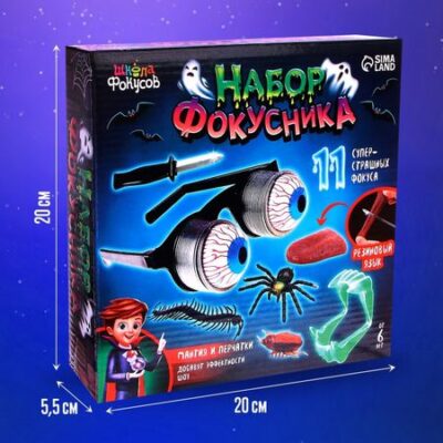 Фокусы «Набор фокусника», 11 фокусов. Приветствуем юных фокусников! Этот набор перенесет вас в мир захватывающих и страшных шоу! С таким набором вы сможете разыграть своих близких. Создавайте уникальные образы, невероятные программы и поражайте публику. Повторяйте фокусы из инструкции, придумывайте свои и воплощайте их с помощью реквизитов из набора. <b> Список фокусов</b> <ol> <li> Будоражащее начало.</li> <li> Искусственный язык.</li> <li> Резиновый паук.</li> <li> Оживший паук.</li> <li> Резиновые насекомые.</li> <li> Классический испуг.</li> <li> Пауки в паутине.</li> <li> Преждевременный испуг.</li> <li> Вонзи нож!</li> <li> Воскрешение.</li> <li> Отрезание языка.</li> </ol> Рекомендовано для детей от 6 лет.