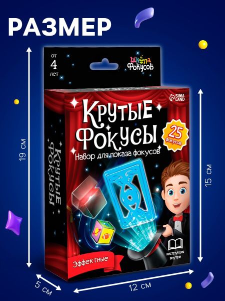 Фокусы «Крутые фокусы. Эффектные», набор 25 фокусов. <em> Удиви зрителей волшебными трюками!</em> Набор «Крутые фокусы» — это готовый реквизит для начинающего иллюзиониста. С ним ребенок освоит первые магические номера, разовьет ловкость рук и уверенность перед публикой. Идеально подходит для домашних выступлений. <b> Особенности</b> <ul> <li> <strong> 25 профессиональных фокусов.</strong> В набор входит все необходимое для эффектных номеров. Каждый трюк сопровождается подробной инструкцией, чтобы ребенок быстро разобрался в механике.</li> <li> Реквизит адаптирован для детей от 6 лет. Безопасные материалы, крупные детали и понятные схемы помогут даже новичку почувствовать себя настоящим магом.</li> <li> Фокусы тренируют память, координацию и артистизм. Ребенок научится выступать перед зрителями, импровизировать и удерживать внимание аудитории.</li> </ul> Набор фокусника — первый шаг в мир сценического мастерства. Он раскрывает творческий потенциал, учит добиваться результата через практику. Отличный вариант для детей, которые любят удивлять и быть в центре внимания. Подарите малышу магию — пусть его глаза загорятся от восторга первых успехов!