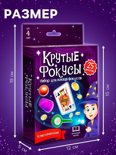 Фокусы «Крутые фокусы. Классические», набор 25 фокусов. <em> Удиви зрителей волшебными трюками!</em> Набор «Крутые фокусы» — это готовый реквизит для начинающего иллюзиониста. С ним ребенок освоит первые магические номера, разовьет ловкость рук и уверенность перед публикой. Идеально подходит для домашних выступлений. <b> Особенности</b> <ul> <li> <strong> 25 профессиональных фокусов.</strong> В набор входит все необходимое для эффектных номеров. Каждый трюк сопровождается инструкцией, чтобы ребенок быстро разобрался в механике.</li> <li> Реквизит адаптирован для детей от 6 лет. Безопасные материалы, крупные детали и понятные схемы помогут даже новичку почувствовать себя настоящим магом.</li> <li> Фокусы тренируют память, координацию и артистизм. Ребенок научится выступать перед зрителями, импровизировать и удерживать внимание аудитории.</li> </ul> Набор фокусника — первый шаг в мир сценического мастерства. Он раскрывает творческий потенциал, учит добиваться результата через практику. Отличный вариант для детей, которые любят удивлять и быть в центре внимания. Подарите малышу магию — пусть его глаза загорятся от восторга первых успехов!