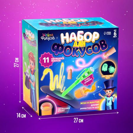 Фокусы, набор 11 светящихся фокусов. Этот набор станет занимательным и увлекательным подарком! В нем уже есть все, чтобы почувствовать себя настоящим фокусником. Магом станет не только ребенок, но и родители! Впереди вас ждут самые захватывающие шоу со светом. Повторяйте фокусы из инструкций и придумывайте свои. <b> В наборе:</b> <ul> <li> краска,</li> <li> пальцы — 2 шт.,</li> <li> шнурок,</li> <li> ручка,</li> <li> цилиндр и мантия,</li> <li> жезл фокусника,</li> <li> тату,</li> <li> инструкция.</li> </ul> Рекомендовано для детей от 6 лет.