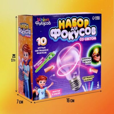 Фокусы со светом, набор 10 фокусов. Приветствуем юных фокусников! Этот набор перенесет вас в мир захватывающих световых шоу! С ним вы сможете разыграть своих близких. Создавайте уникальные образы, невероятные программы и поражайте публику. Повторяйте фокусы из инструкции, придумывайте свои и воплощайте их с помощью реквизитов из набора. <b> Список фокусов</b> <ol> <li> Источник энергии.</li> <li> Волшебные зажигалки.</li> <li> Поймай свет.</li> <li> Раздвоение.</li> <li> Нюх.</li> <li> Волшебное попадание света в бутылку.</li> <li> Рикошет от стены.</li> <li> Волшебная ручка.</li> <li> Подарок.</li> <li> Цветное свечение.</li> </ol> Рекомендовано для детей от 6 лет.