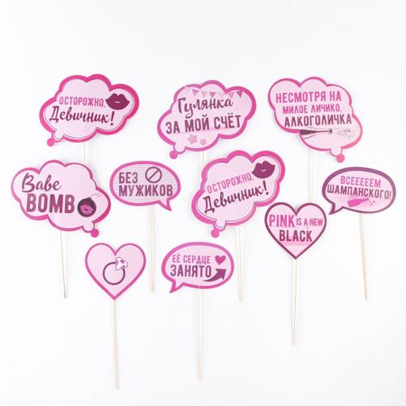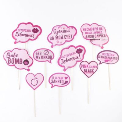 Фотобутафория на девичник «Всем шампанского», 10 шт.. Набор для фотосессии 10 предметов. Аксессуары для фотосессий сделают любую вечеринку незабываемой, ведь ни один праздник не обходится без фото, будь то день рождения, гендерпати, 23 февраля, 8 марта, Новый год, свадьба, девичник или просто праздничная вечеринка. На любом празднике хочется выделяться, а карточки для фотобутофории отлично выполнят эту задачу, сделают вас заметным и неповторимым. Любой ребенок, девочка или мальчик, обязательно захотят сфотографироваться с набором аксессуаров для фотосессии. Данный набор фотобутофории отличный вариант для девичника, замечательно впишется в любую тематику торжества.
