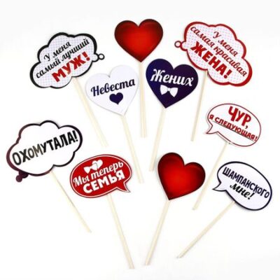 Фотобутафория на свадьбу «Жених и невеста», 10 шт.. Набор для фотосессии 10 предметов. Аксессуары для фотосессий сделают любую вечеринку незабываемой, ведь ни один праздник не обходится без фото, будь то день рождения, гендерпати, 23 февраля, 8 марта, Новый год, свадьба, девичник или просто праздничная вечеринка. На любом празднике хочется выделяться, а карточки для фотобутофории отлично выполнят эту задачу, сделают вас заметным и неповторимым. Любой ребенок, девочка или мальчик, обязательно захотят сфотографироваться с набором аксессуаров для фотосессии. Данный набор фотобутофории отличный вариант для свадьбы, замечательно впишется в любую тематику торжества.