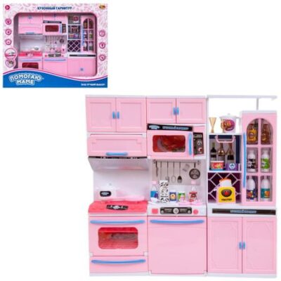 Кукольная кухонный гарнитур «Помогаю маме» со светом и звуком.Подходит для кукол высотой не более 32см, типа «Барби».Набор состоит из 3-х секций:- секция с плитой, — секция со шкафами с дверцами и полками,- секция с посудомоечной машиной и микроволновой печью,Все дверцы в секциях открываются.В наборе, также находятся различные кухонные аксессуары (посуда, продукты и тд).Размер гарнитура: 33,5*32*7см.Для работы требуются 3 батарейки типа «AG13» (в комплекте).