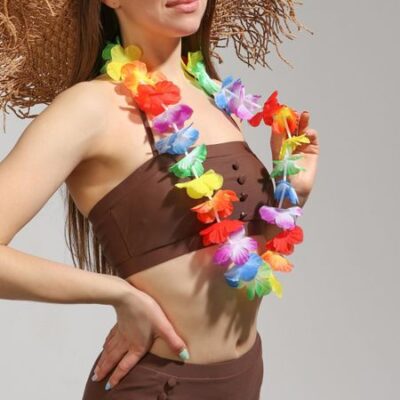 Гавайское ожерелье «Цветок плюмерия». Решили устроить гавайскую вечеринку? Много одежды для такого праздника не потребуется: жизнерадостные островитяне привыкли жить налегке. Основное внимание уделите аксессуарам и ярким краскам. Ожерелье преобразит любой костюм: в образ аборигена внесет традиционные финальные штрихи, а в обычный наряд добавит капельку южного тепла и романтики. Раздайте ожерелья всем приглашенным на входе: именно с таким радушием гавайцы встречают своих гостей. Этим аксессуаром можно до неузнаваемости изменить пространство вокруг себя. А в нарядном помещении появляется желание новых свершений и побед. Экзотические цветы навеют мысли о солнце и море, останется добавить лучезарную улыбку, и обычное застолье превратится экзотическое веселье. <b> Длина ожерелья: 50 см. </b>