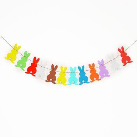 Гирлянда «Зайка» 2 метра. Хотите сделать интерьер более праздничным в преддверии Пасхи или украсить комнату именинника? Универсальная гирлянда «Зайка» поможет вам в этом и создаст торжественное настроение дома или в офисе! А еще если таким аксессуаром дополнить фон для фотосессии — снимки получатся более стильными и эффектными. <b> Подробнее о гирлянде</b> <ul> <li> Длина — 2 м.</li> <li> Размер зайчика: 14,5 × 7,5 см.</li> <li> В наборе 12 фигур.</li> <li> Выполнена из ПВХ.</li> <li> Хвостики зайчиков — объемные помпоны (зафиксированы клеем).</li> <li> Гирлянда приходит в разобранном виде. Чтобы собрать ее, необходимо продеть через все фигурки веревку (входит в комплект).</li> <li> Клейкой стороны на зайчиках не предусмотрено, что делает декорацию универсальной. Ее можно закрепить иголкой, булавкой или клейкой лентой на любой поверхности.</li> </ul>