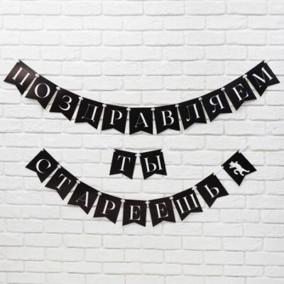 Гирлянда на ленте «Поздравляем, ты стареешь», 300 см. <b> Гирлянда на ленте «Поздравляем, ты стареешь», 300 см</b> Создать соответствующее настроение дома или в офисе поможет оригинальная гирлянда! Она станет завершающим праздничным акцентом в интерьере. Декор легко подвесить за ленту или прикрепить к стене (дверному проему) с помощью кнопок. Проденьте сквозь них ленточку, и праздничное украшение готово! Длина гирлянды — 300 см., плотность картона — 220 гр/кв.м., размер одного флажка — 12 х 14 см.