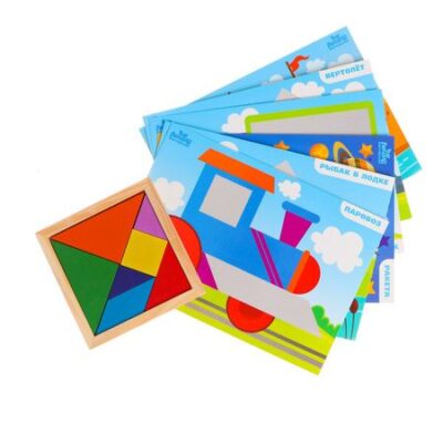Головоломка «Танграм» транспорт, с шаблонами. Танграм — одна из самых древних головоломок мира. Головоломка состоит из плоских геометрических фигур (танов). Суть игры: собрать определенные изображения по схеме, причем в рисунке должны участвовать все таны. Почему полезно заниматься с танграмом? <ul> <li> во время сборки задействованы оба полушария (развивается воображение и логическое мышление)</li> <li> развивается мелкая моторика и координация движений</li> <li> развивается усидчивость, внимание и память Во время игры малыши быстро запоминают геометрические фигуры, а также цвета, начинают понимать смысл "части" и "целого". Уверяем, от этой головоломки не смогут оторваться даже непоседы! </li> </ul>