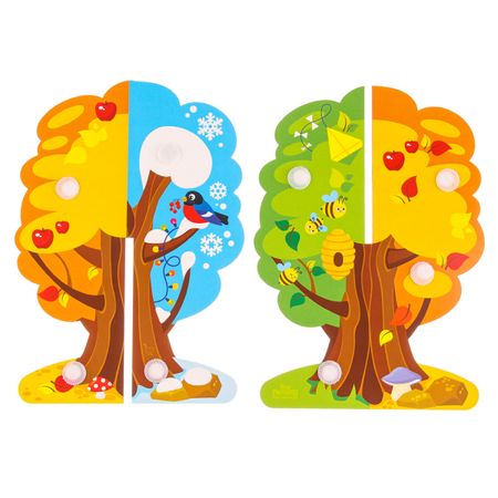 Головоломка «Липучки. Времена года». Изучаем времена года с яркими липучками! Cобирайте пушистое дерево, вращайте крону и крепите определенные липучки. Перед началом можете спросить у ребенка, что для него характеризует зиму, весну, лето и осень. Затем приступайте к игре. Во время крепления липучек рассказывайте малышу об особенностях каждого времени года, придумывайте сюжеты и разыгрывайте истории.