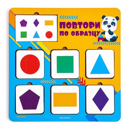 Головоломка деревянная. Повтори по образцу «Геометрические фигуры», развивающие игры для детей. Игра «Повтори по образцу» изготовлена из дерева, а значит, она прочная и безопасная. <b> Особенности игрушки:</b> <li> Размер деревянной основы: 20 х 20 см</li> <li> Количество деталей: 6 штук</li> <li> Количество карточек со схемой: 8 штук</li> <b> Как играть</b> <ol> <li> Для начала возьмите карточку с заданием, пусть малыш внимательно рассмотрит ее.</li> <li> Предложите крохе повторить по образцу: разместите детали в деревянной основе так, как указано на карточке.</li> </ol> <b> Чем полезна игра</b> Такие занятия помогут выучить цвета и формы, потренировать аналитическое и пространственное мышление, внимание и память.