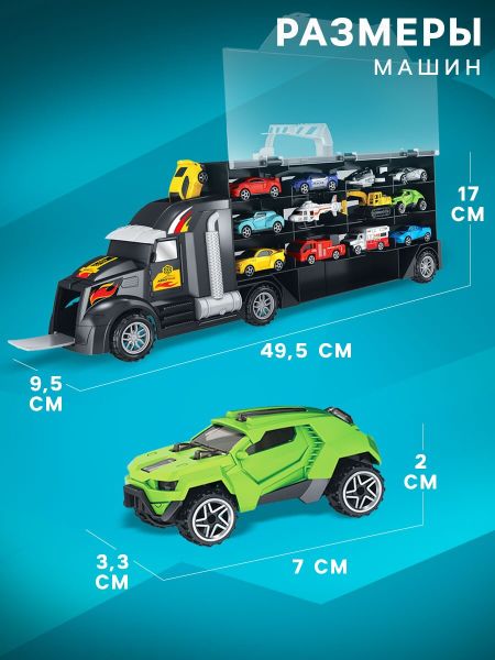 Грузовик «Перевозчик», в комплекте 10 машин и 2 вертолета. «Перевозчик» готов доставить спорткары для скоростных соревнований в любое время и в любое место. Загрузите машины в кузов автомобиля и начинайте игру. С яркими болидами игровым сюжетам не будет предела. Ребенок устроит настоящие гонки и будет состязаться с друзьями в быстрой и маневренной езде. <b> Особенности набора</b> <ul> <li> Размер перевозчика: 49,5 × 9,5 × 17,5 см.</li> <li> Размер спортивных машин (8 шт.): 7 × 3,3 × 2 см.</li> <li> Размер вертолетов (2 шт.): 7,5 × 2 × 4 см.</li> <li> Размер внедорожников (2 шт.): 6,5 × 3,5 × 3,5 см.</li> <li> Все элементы выполнены из безопасного для детей пластика. Краска не содержит вредных веществ.</li> <li> Для детей старше 3 лет.</li> </ul> <b> Увлекательно и полезно</b> Разнообразная техника доставит малышу радость, будет способствовать развитию пространственного и образного мышления, мелкой моторики, координации движений и эмоционального восприятия. Ни один юный гонщик не останется равнодушным!